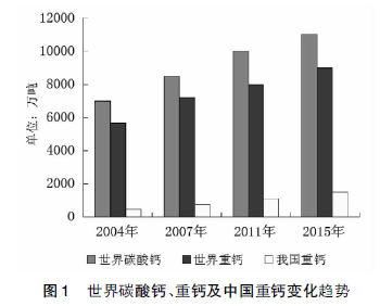 據(jù)oskill 報道,2007 年世界碳酸鈣產(chǎn)量約8 500 萬t,其中重鈣約7 200 萬t,中國重鈣約750 萬t; 2011 年,世界碳酸鈣產(chǎn)量約1 億t,其中重鈣超過8 000 萬t,中國重鈣約1 100 萬t。據(jù)估計2015 年,碳酸鈣產(chǎn)量將超過1.1 億t,其中重鈣可達9 000 萬t,而中國重鈣約1 500 萬t。近年來,世界碳酸鈣、重鈣及中國重鈣的變化趨勢如圖1 所示。
