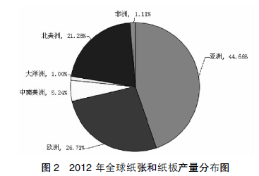 世界造紙行業(yè)從20 世紀80 年代初便開始成功的轉(zhuǎn)向堿性或中性造紙工藝,這極大的提高了造紙對重鈣的需求,為重鈣產(chǎn)品提供了一個巨大的應(yīng)用市場。在造紙中添加碳酸鈣可使涂布均勻、亮度好、摩擦度低、結(jié)構(gòu)堅實、易排濕以及易干燥等。2012 年全球紙張和紙板總量為3.998 億t,亞洲、北美洲和歐洲作為全球主要的紙張和紙板生產(chǎn)地,其產(chǎn)量占全球總量的90 %以上,其中亞洲占44.66%,如圖2 所示。